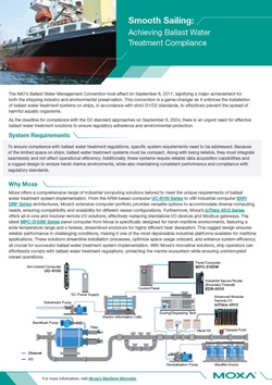 The IMO’s Ballast Water Management Convention mandates the installation of ballast water treatment systems on ships to prevent the spread of harmful aquatic organisms. With the D2 compliance deadline approaching on September 8, 2024, there's an urgent need for effective solutions. These systems must be compact, robust, and easily integrated into existing vessels, with reliable data acquisition and a rugged design that can withstand harsh marine conditions while meeting regulatory requirements. Discover our comprehensive solutions to meet these standards.