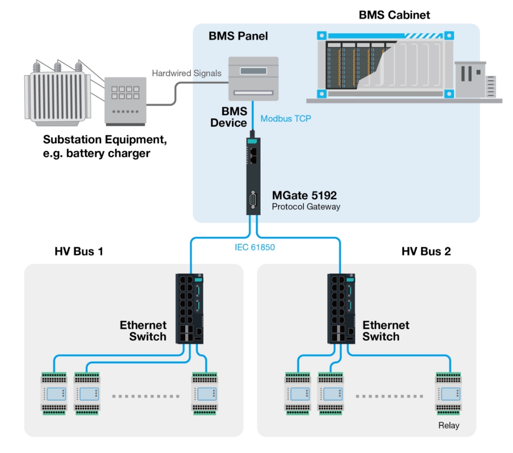 In a power substation, SCADA monitors power generation and consumption. However, newly purchased IEDs run the IEC61850 protocol, whereas the legacy SCADA and battery management system (BMS) run Modbus TCP. Overcoming this compatibility issue was required.