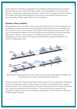 This white paper describes how Dynamic Ring Coupling helps railway operators provide seamless onboard Ethernet redundancy with both rapid recovery times and automatic Ethernet switch configuration even when consists are rearranged mid-journey.
