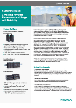 This application note explores the improvement of Battery Energy Storage Systems (BESS) using Battery and Energy Management Systems (BMS/EMS). It addresses the critical need for effective data management and introduces solutions such as the Edge Gateway AIG-302 Series and Data Logger DRP-C100 Series to overcome challenges in data storage and cloud connectivity. This note underscores Moxa's commitment to efficiency and reliability in BESS operations, with solutions especially tailored for system integrators and BESS builders. Elevate your BESS solutions with our latest technologies. Download now to unlock the full potential of your energy storage projects!