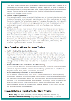 To achieve full integration of all onboard systems, train operators need an onboard controller that will report the status of train doors, HVACs, compressors, brakes, lights, and other key train infrastructure. These reports must be made in a way that helps maintenance engineers identify potential problems in a timely manner, so they not only reduce maintenance efforts, but also provide a better overall availability and higher quality of service.